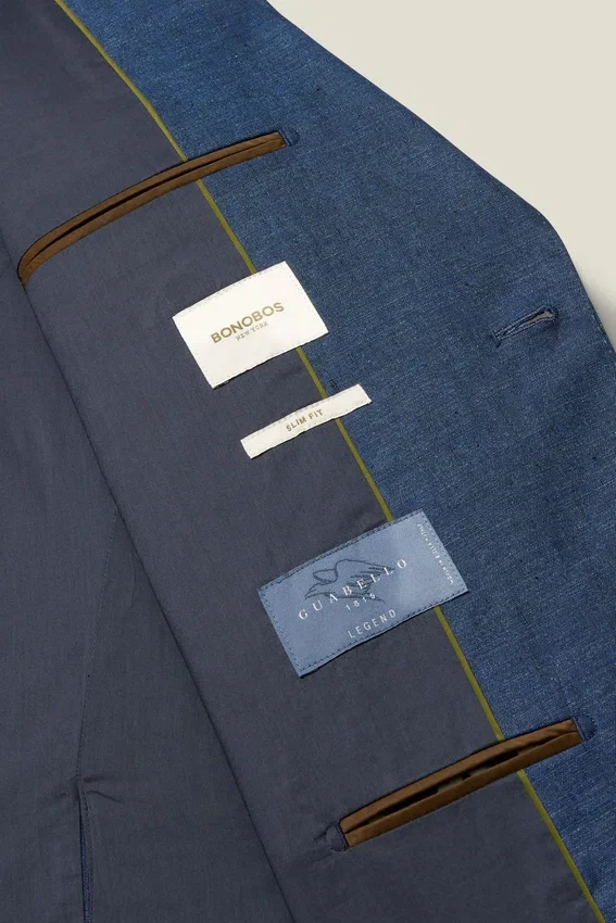 Tissu Guabello | Construction partiellement entoilée | Revers en V | 2 boutons sur le devant | Double fente | Poignets à boutons non fonctionnels pour faciliter l’ajustement des manches | Intérieur entièrement doublé | Broderie florale Bonobos personnalisée à l’intérieur | Imprimé Bonobos personnalisé à l’intérieur | Épingle de revers amovible