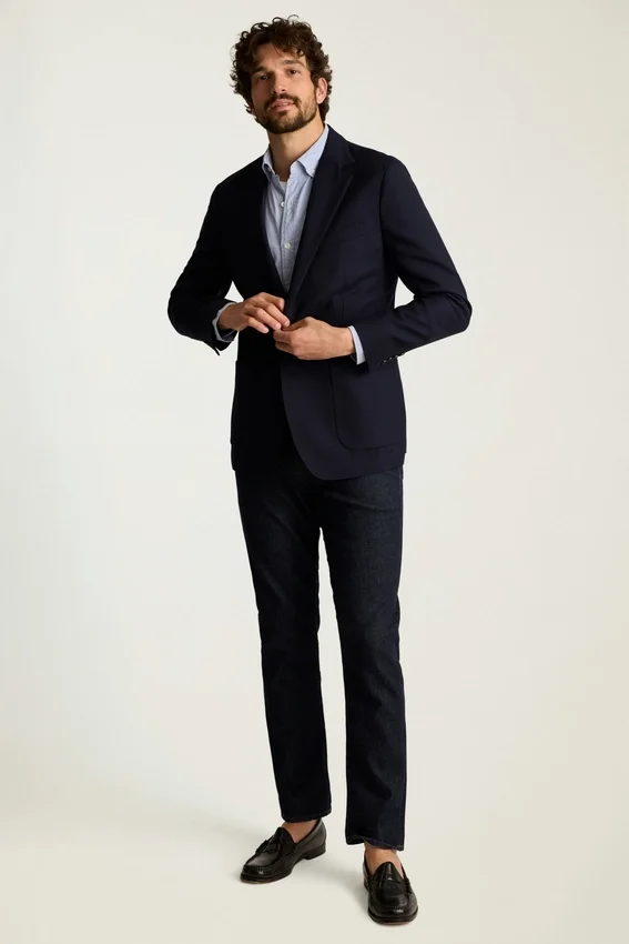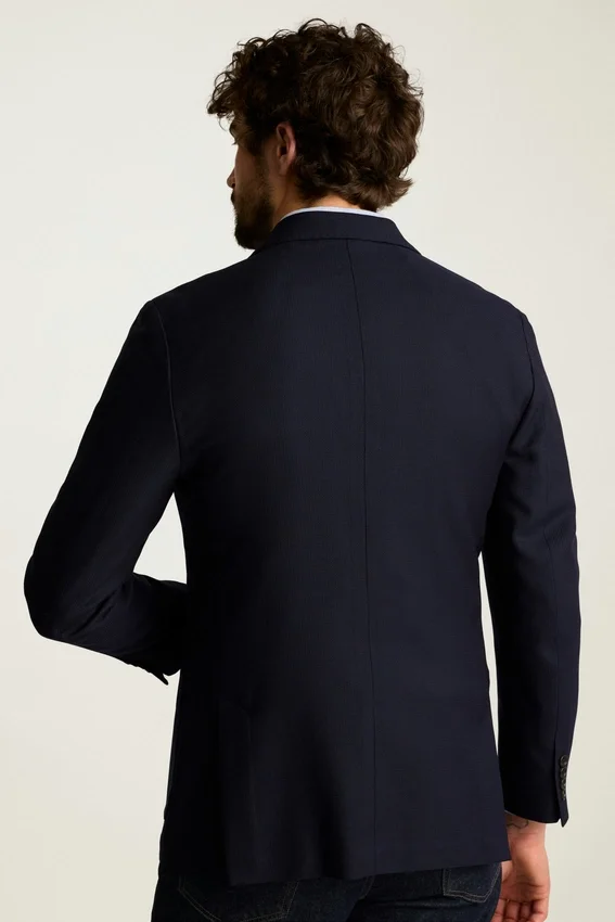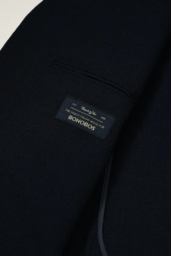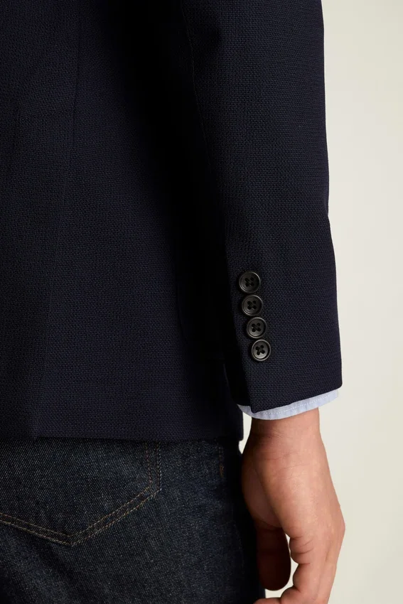 Coupe légère et doublure minimale | Laine Hopsack respirante provenant de la filature italienne Marzotto | Revers de 8,25 cm | Poches plaquées | Croisé simple à deux boutons | Intérieur non doublé avec renforts aux épaules et bordures aux coutures | Doublure aux manches | Boutons décoratifs aux poignets | Double fente | Poches passepoilées intérieures