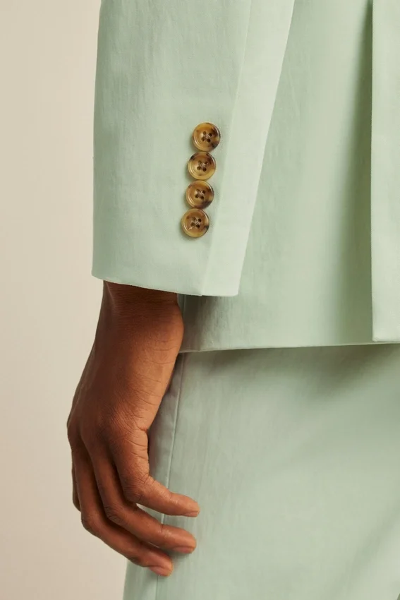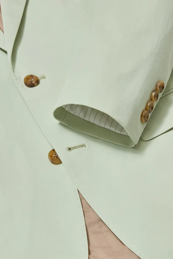 Caractéristiques de la veste Revers en pointe | Poches plaquées | 2 boutons, coupe droite | Intérieur non doublé avec bordure aux coutures | Poches passepoilées intérieures | Boutons décoratifs aux poignets | Double fente | Coupe légère