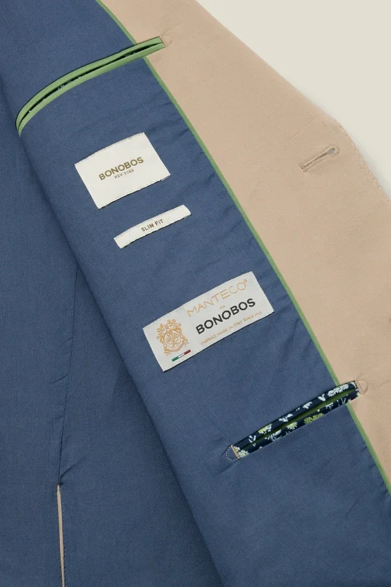 Tissu Manteco | Construction semi-entoilée | Revers en V | 2 boutons sur le devant | Double fente | Poignets à boutons non fonctionnels pour faciliter l’ajustement des manches | Intérieur entièrement doublé | Broderie fleur Bonobos personnalisée à l’intérieur | Imprimé Bonobos personnalisé à l’intérieur