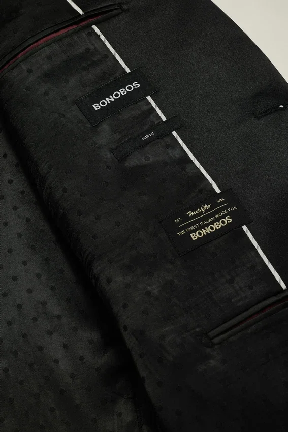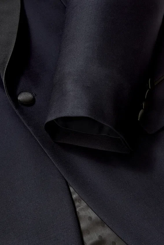 Ce smoking entièrement doublé est confectionné dans une laine stretch Barethea de Marzotto.| Revers en pointe en satin contrasté | Bouton unique recouvert de satin sur le devant | Poches à rabat | Intérieur entièrement doublé de jacquard à pois | Doublure des manches, poches intérieures et passepoil intérieur contrastés en Bemberg | Fentes arrière