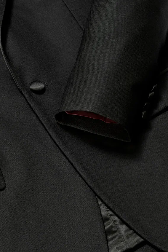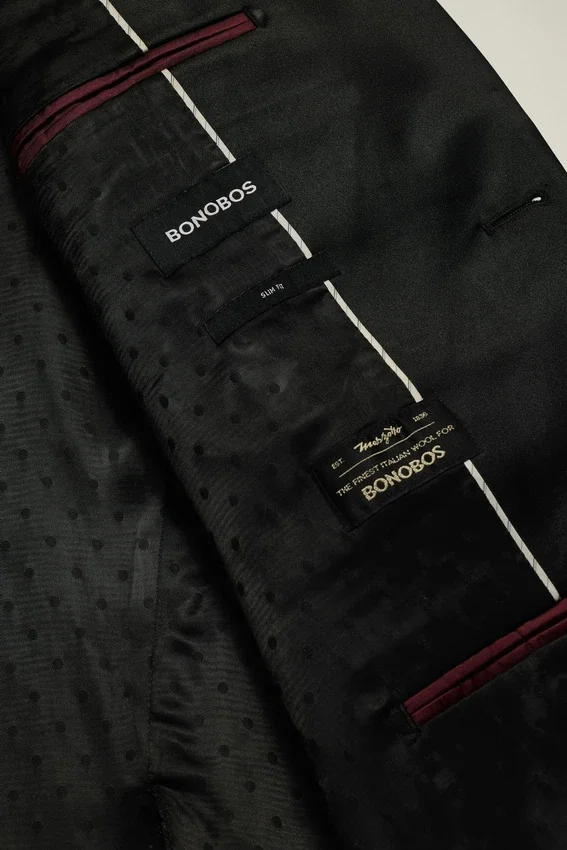 Revers en pointe contrasté en satin | Bouton unique recouvert de satin sur le devant | Poches à rabat | Intérieur entièrement doublé de jacquard à pois | Doublure des manches, poches intérieures et passepoil intérieur contrasté en Bemberg | Fentes arrière