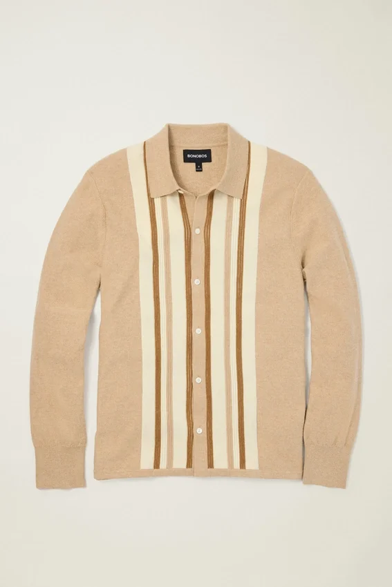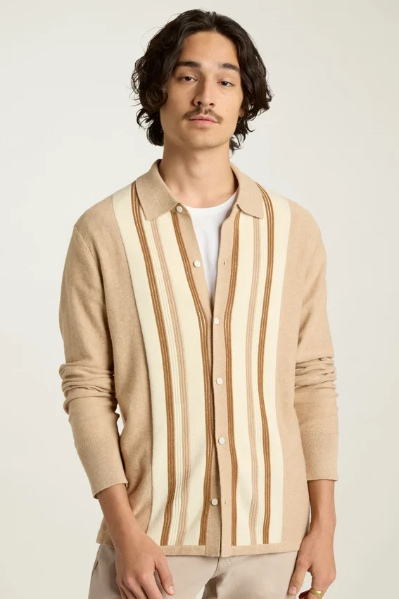 Fil de coton et cachemire ultra-doux | Rayures verticales texturées multicolores sur le devant | Couleur unie au dos et sur les manches | À porter seul comme une chemise ou ouvert comme un cardigan