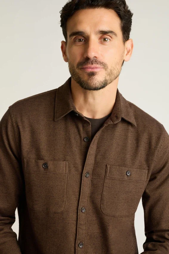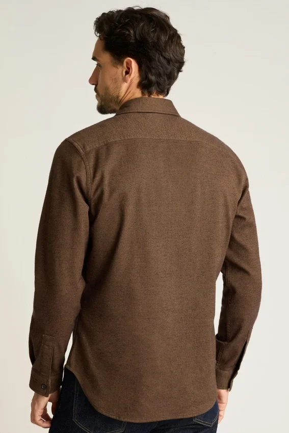 Tissu en flanelle extensible au toucher doux | Deux poches poitrine | Tissu gris chiné placé à l’intérieur de l’empiècement arrière et de la patte de boutonnage