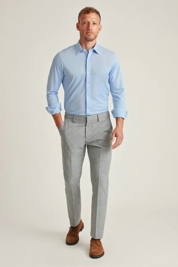Col en pointe modifié | Poignets à double bouton | Patte de boutonnage française | Baleines de col « Stay Handsome » | Infroissable