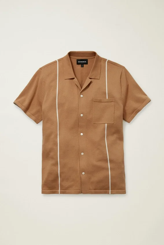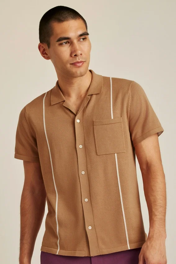 Fil de coton doux et respirant, coupe à patte de boutonnage intégrale avec rayures verticales et poche poitrine gauche pour un look à la fois tendance et rétro.