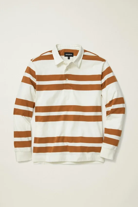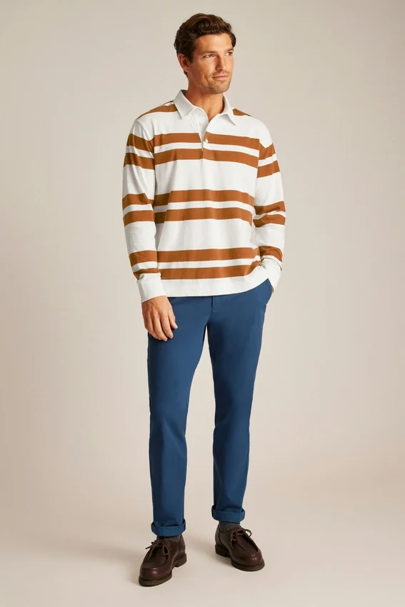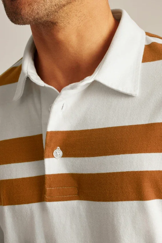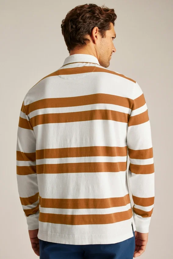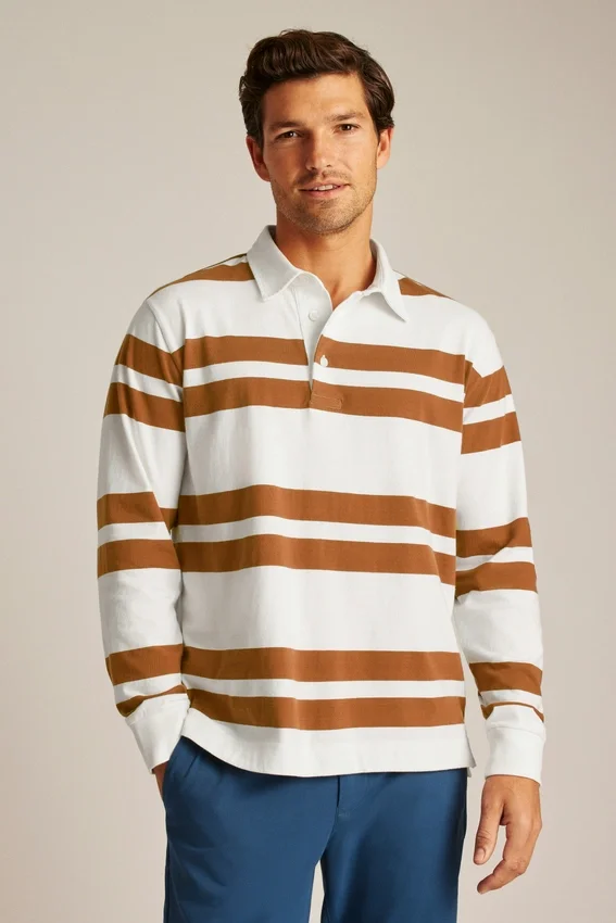 Ce polo de rugby mi-épais est parfait pour les journées fraîches, avec son tissu en coton doux et respirant et son motif à rayures irrégulières qui apporte une touche stylée à un style classique.