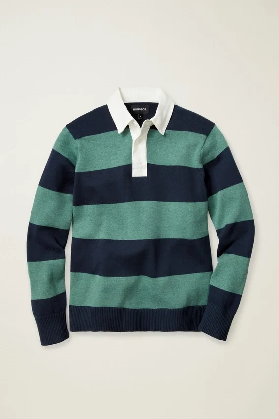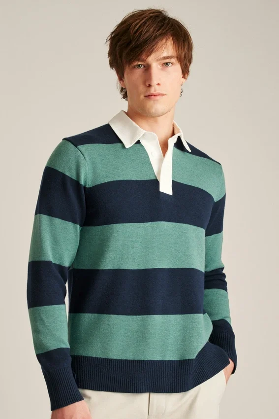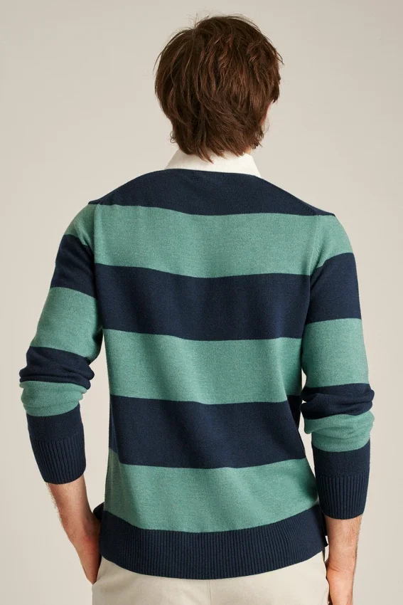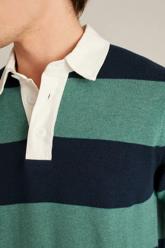Fil de coton doux avec une touche de laine pour plus de chaleur | Tricoté avec des rayures rugby classiques teintes dans la masse | Col et patte de boutonnage en sergé tissé