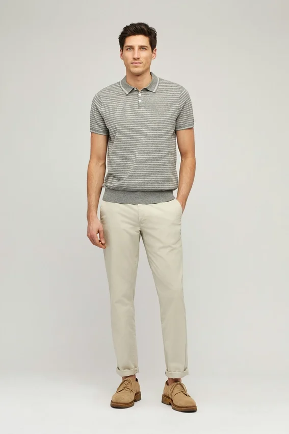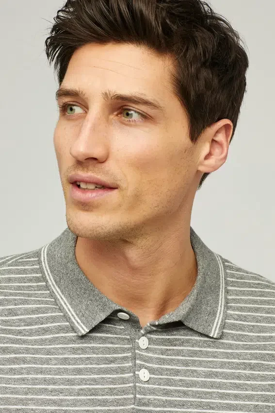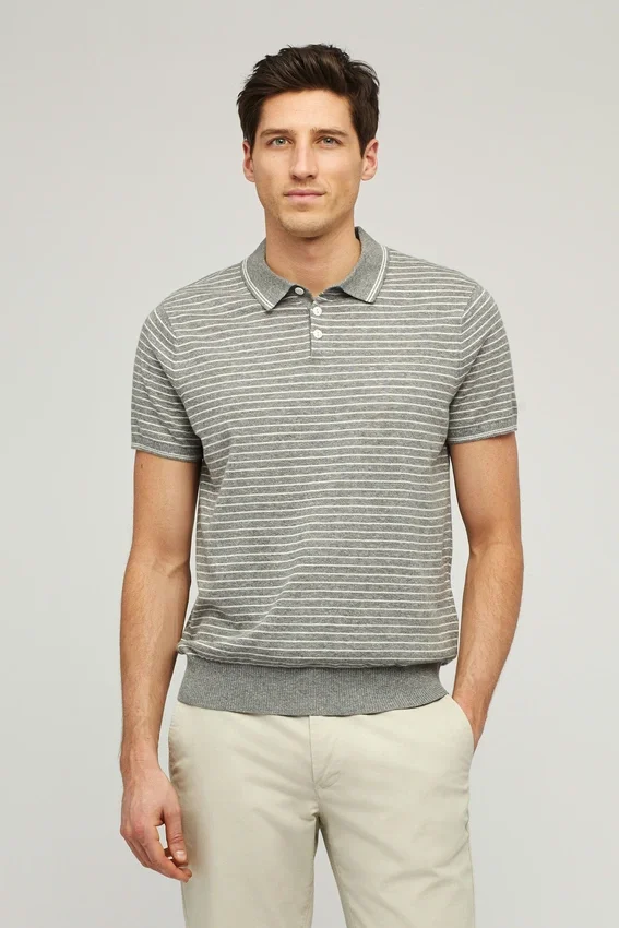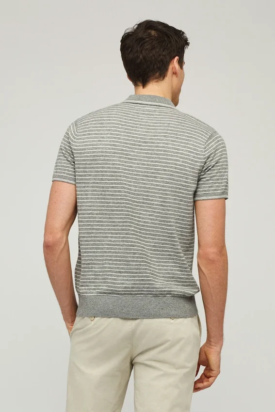 Fil de coton et lin léger et respirant | Rayures teintes dans la masse | Col en côtes 1×1 avec patte de boutonnage ouverte