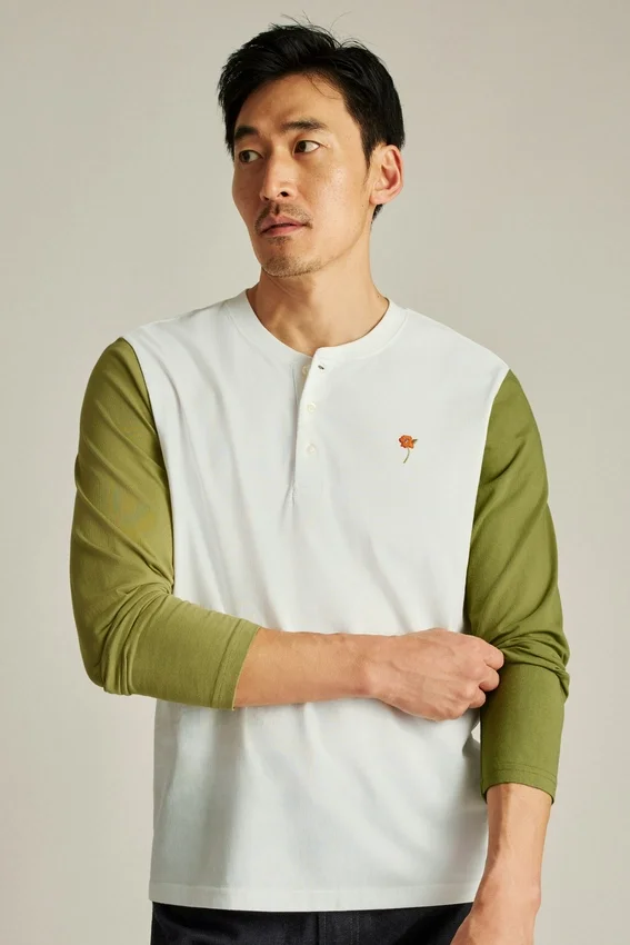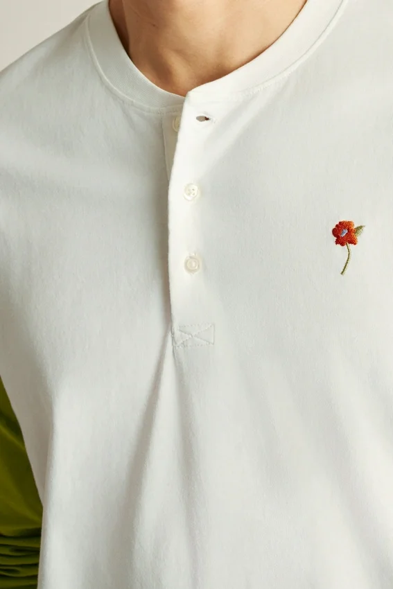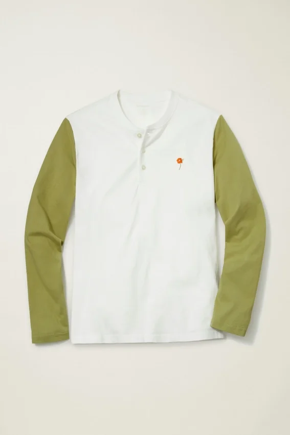 Tissu jersey de poids moyen en coton doux et respirant | Manches de couleur contrastée | Encolure Henley avec patte de boutonnage cachée | Broderie sur la poitrine gauche