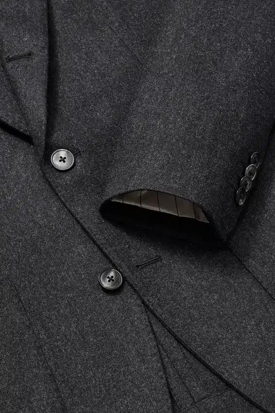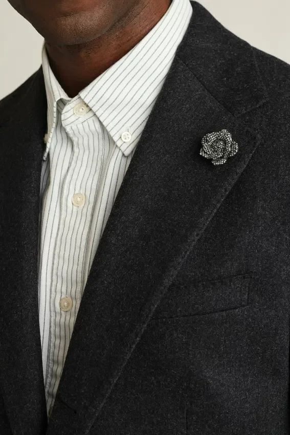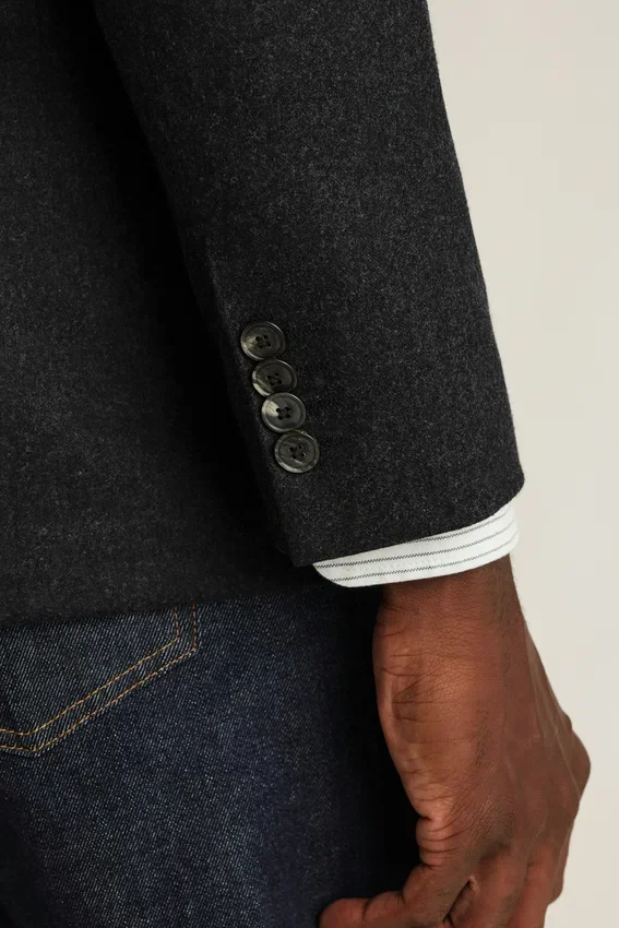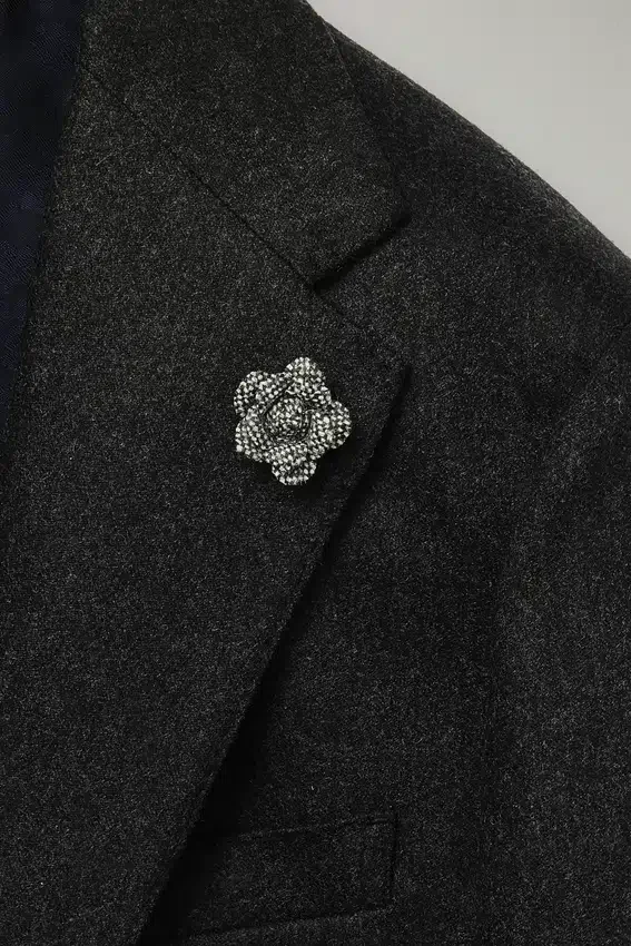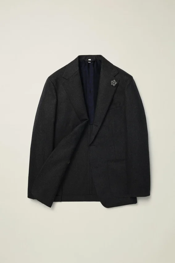 Tissu haut de gamme en laine et cachemire provenant de la filature italienne Tollegno | Broche florale sur le revers composée de chutes de tissu Donegal | Demi-doublure en jacquard sur mesure | Doublure des manches en Bemberg | Poches intérieures avec boutons en nacre véritable| Surpiqûres sur l’ensemble | Boutons en corne véritable | Boutons non fonctionnels aux poignets | Fentes arrière