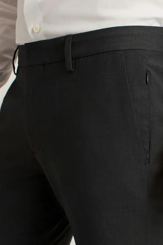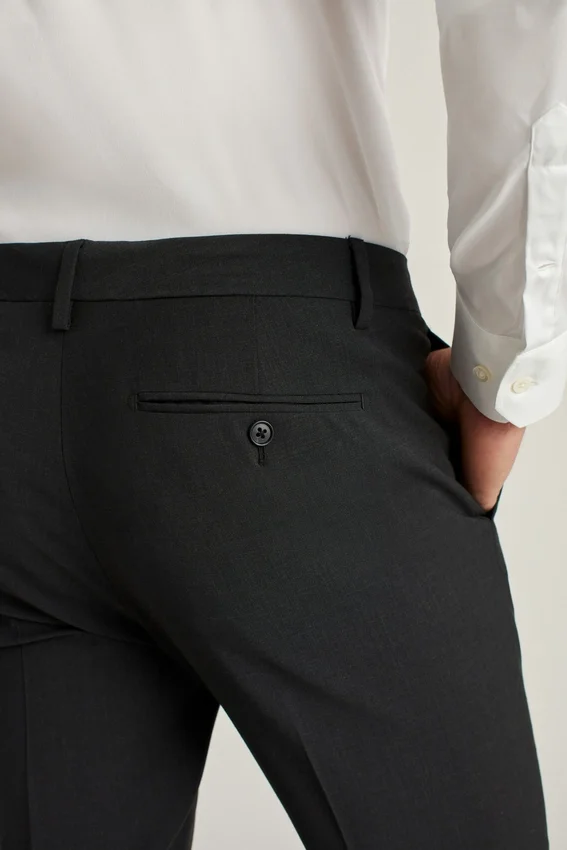 Le mannequin mesure 1,88 m, a un tour de taille de 81 cm et porte un pantalon de costume Slim Fit taille 81 cm. Le pantalon de costume est livré non ourlé avec un entrejambe de 94 cm.