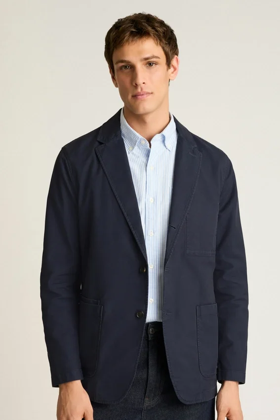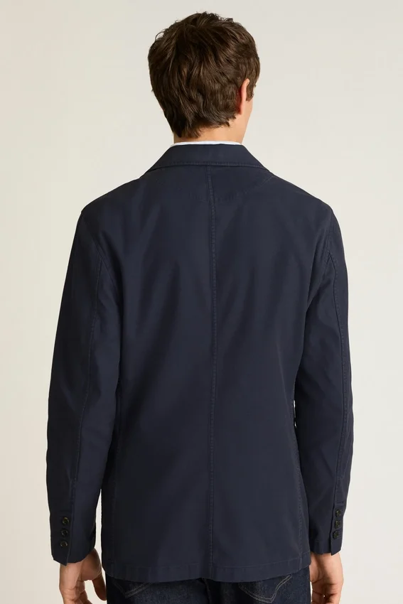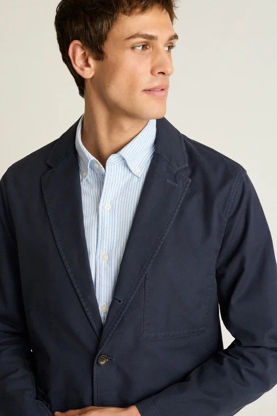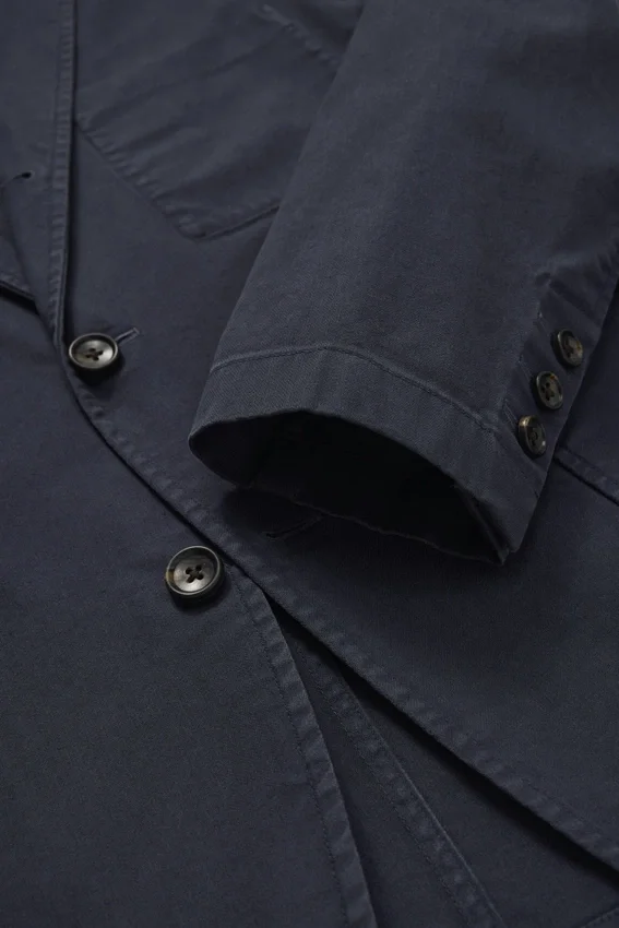 Revers cranté | Coupe à trois plis et deux boutons | Entièrement non doublé et Unconstructed | Poches plaquées à la taille | Poche intérieure | Boutons de manchette fonctionnels | Boucle de suspension intérieure