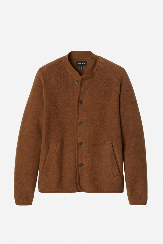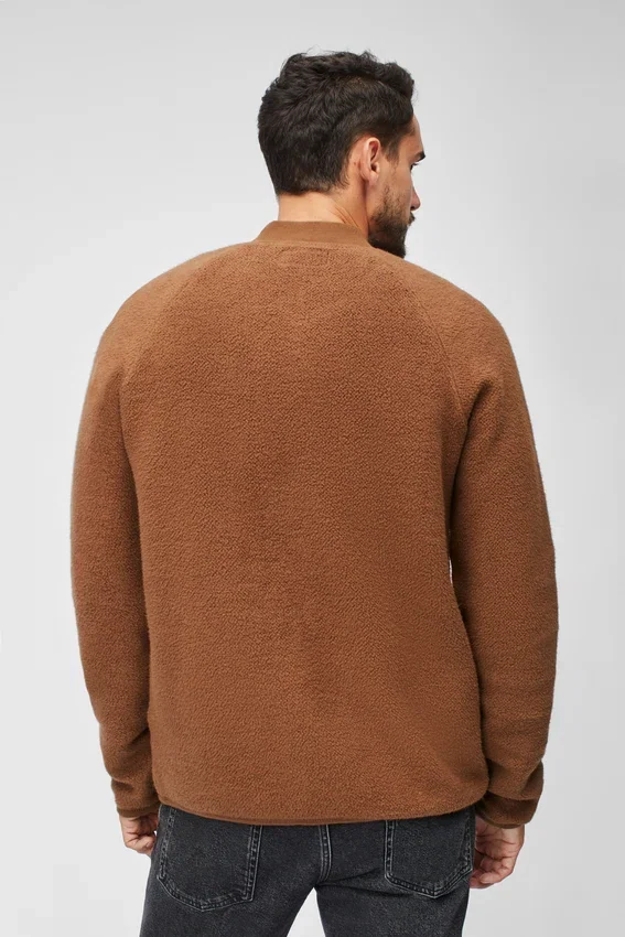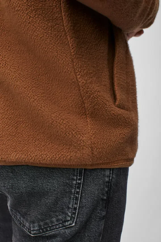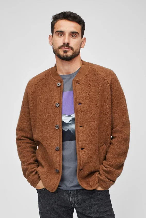 Tissu French Terry brossé, doux et texturé | Coutures recouvertes de surpiqûres avec bordures en jersey | Col côtelé 1×1 | Boutons à l’ouverture
