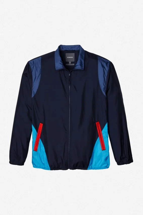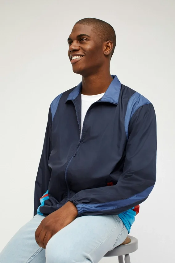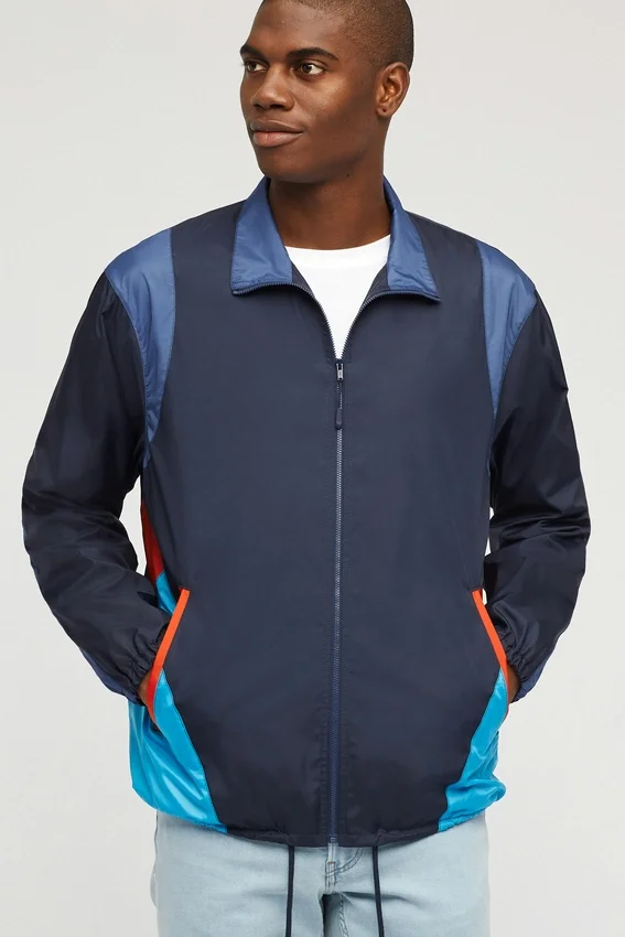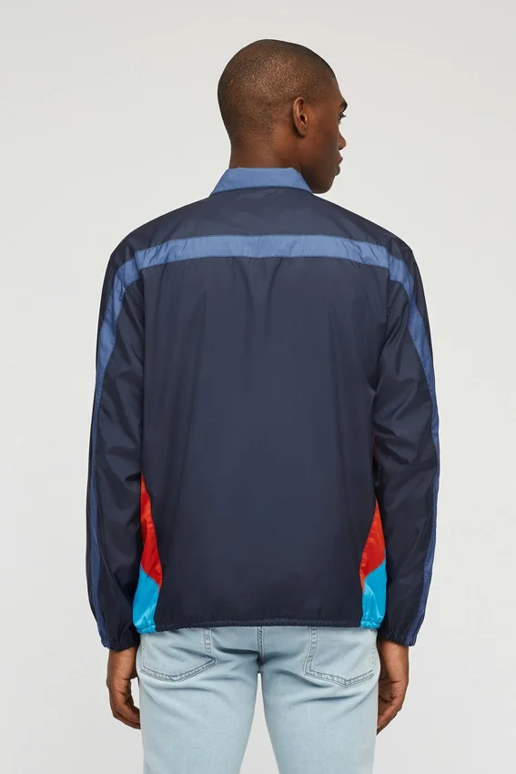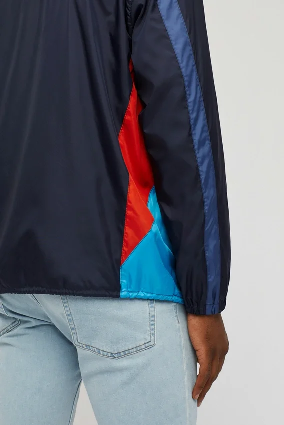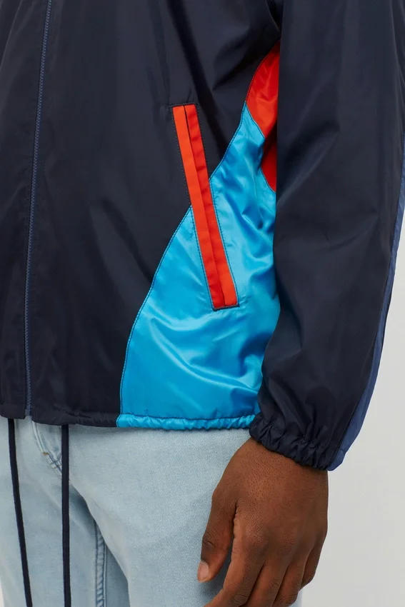 Tout droit sorti des années 80, voici notre coupe-vent de style rétro. Il est bleu et bleu clair avec des touches orange. Doubles poches, doublure en maille et super confortable. Livraison gratuite !
