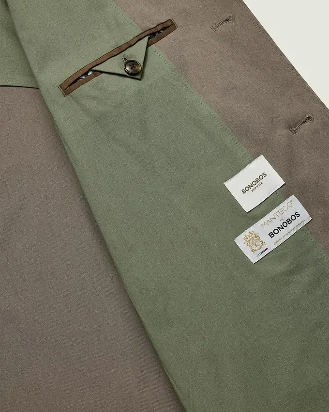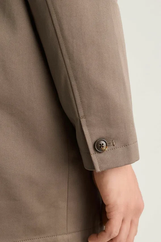 Tissu italien résistant à l’eau | Patte de boutonnage sur le devant | Poches passepoilées | Poignets fonctionnels | Intérieur partiellement doublé | Poches intérieures | Fente arrière