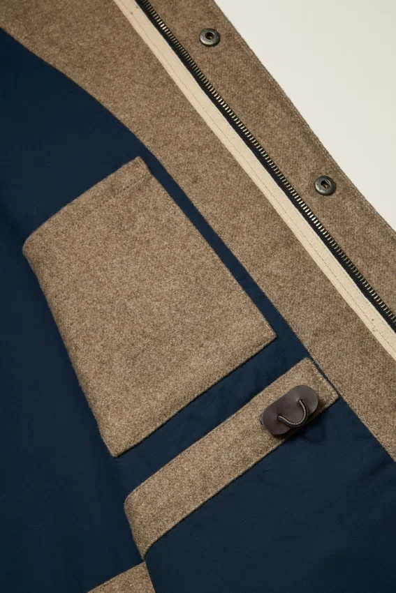 Confectionnée en laine Melton d’Italie | Poches plaquées à la taille avec boutons-pression | Poches chauffe-mains | Fermeture à glissière double sens avec boutons-pression | Col montant avec patte de fixation | Manches raglan | Poignets tempête en tricot à l’intérieur des manches | Poche intérieure | Boucle de suspension | Intérieur entièrement doublé et matelassé avec rembourrage Primaloft®