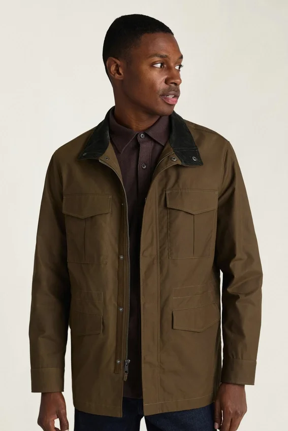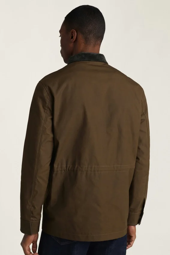 Coton ciré de fabrication britannique | Résistant à l’eau | Col montant avec doublure en velours côtelé à l’intérieur | Rabat-tempête avec boutons-pression et fermeture éclair | Fermeture à boutons-pression sur les poches | Intérieur entièrement doublé | Poche intérieure et boucle de suspension