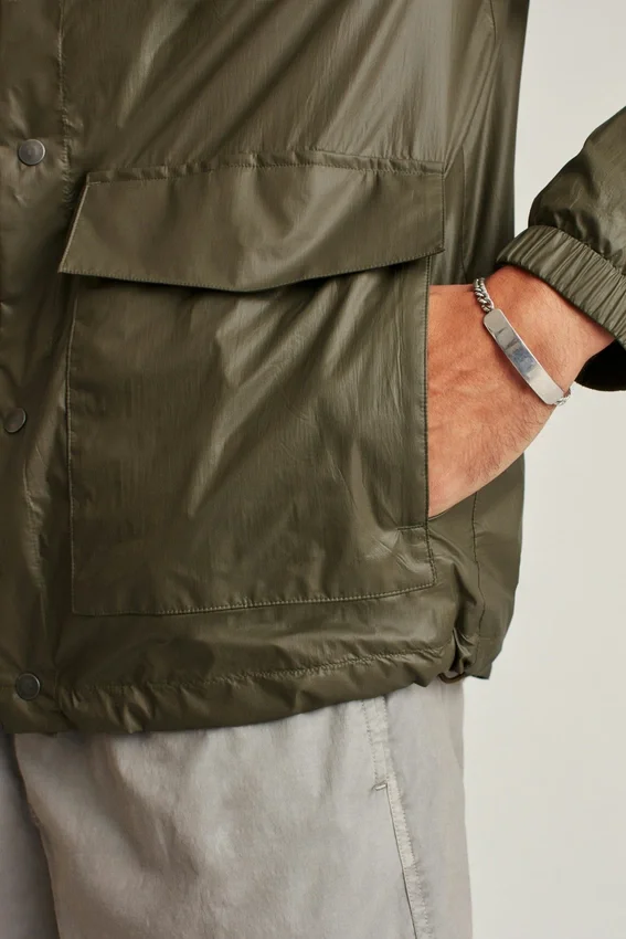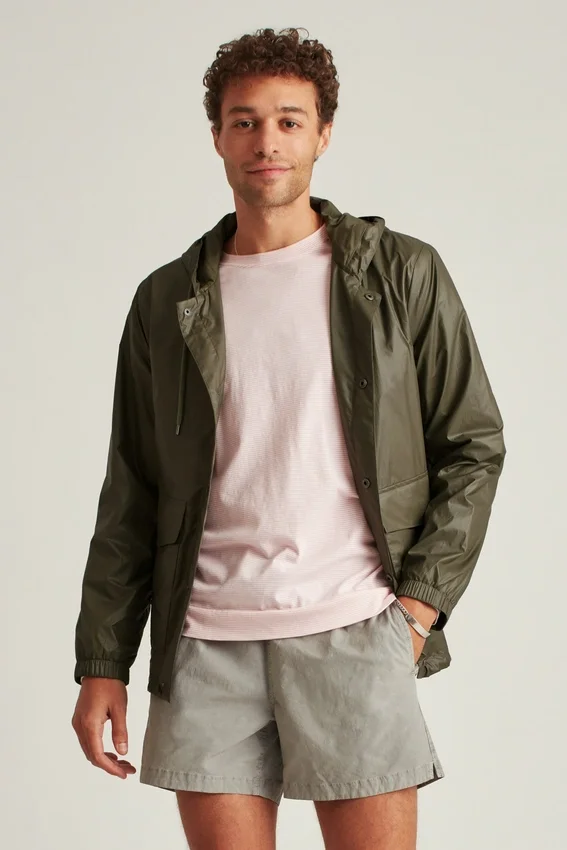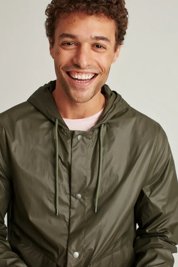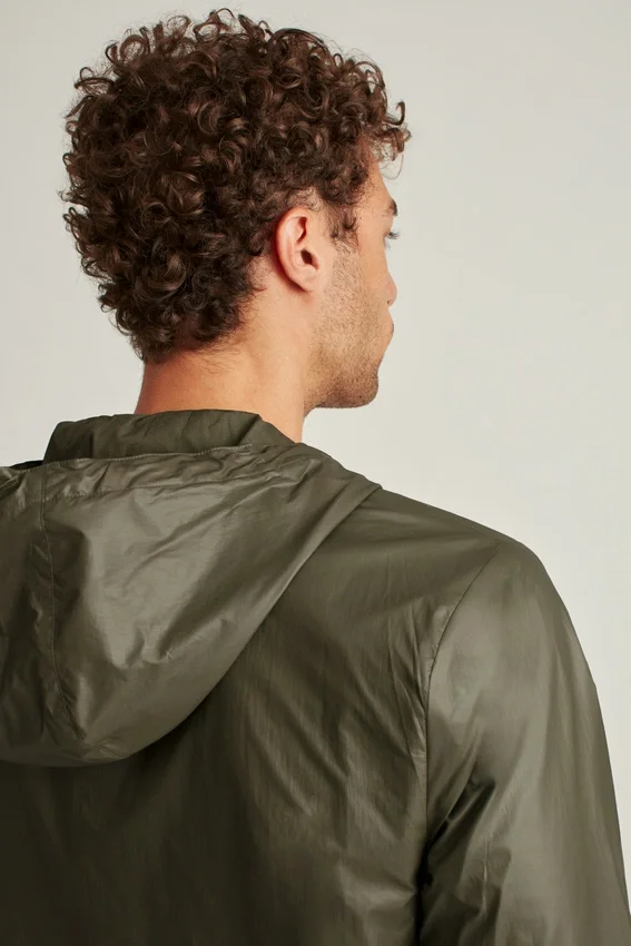 Veste de pluie légère à capuche avec fermeture à boutons-pression | Cordon de serrage au niveau de la capuche | Élastiques aux poignets | Cordon de serrage réglable au bas | Boucle de suspension