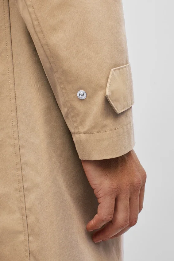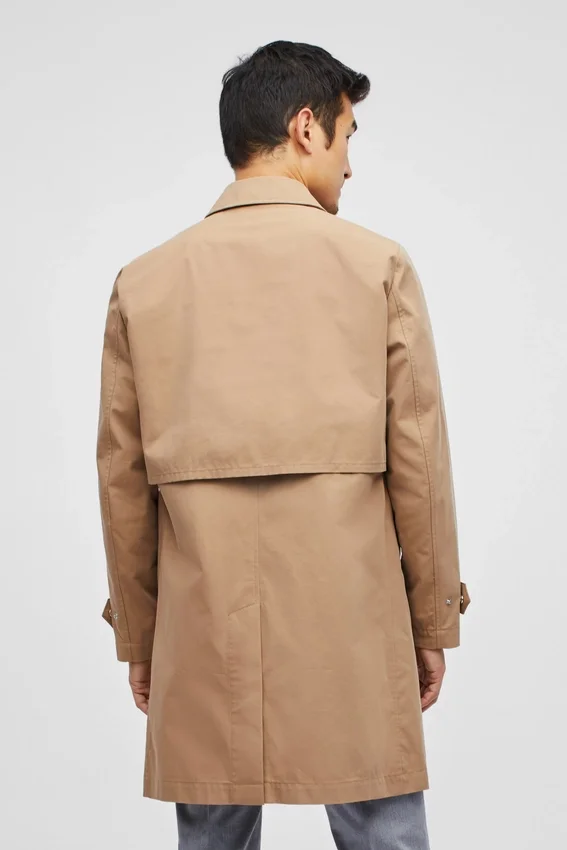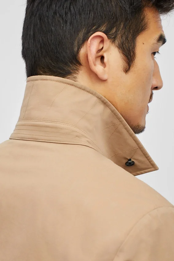 Tissu italien imperméable | Dos aéré avec rabat | Poches plaquées intérieures | Attache sous le col | Boucle de suspension | Fermeture à glissière sur le devant avec boutons-pression cachés | Boutons-pression réglables aux poignets