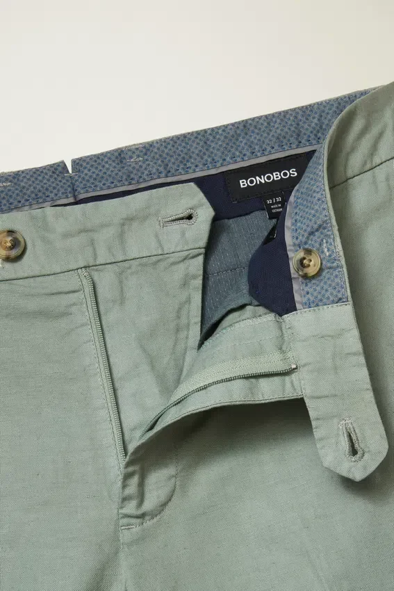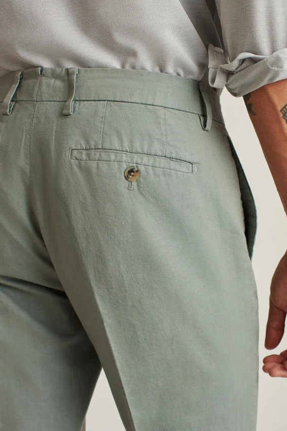Chino haut de gamme en mélange coton/lin | Patte et boutons allongés sur les poches arrière | Doublure intérieure discrète | Poche à monnaie