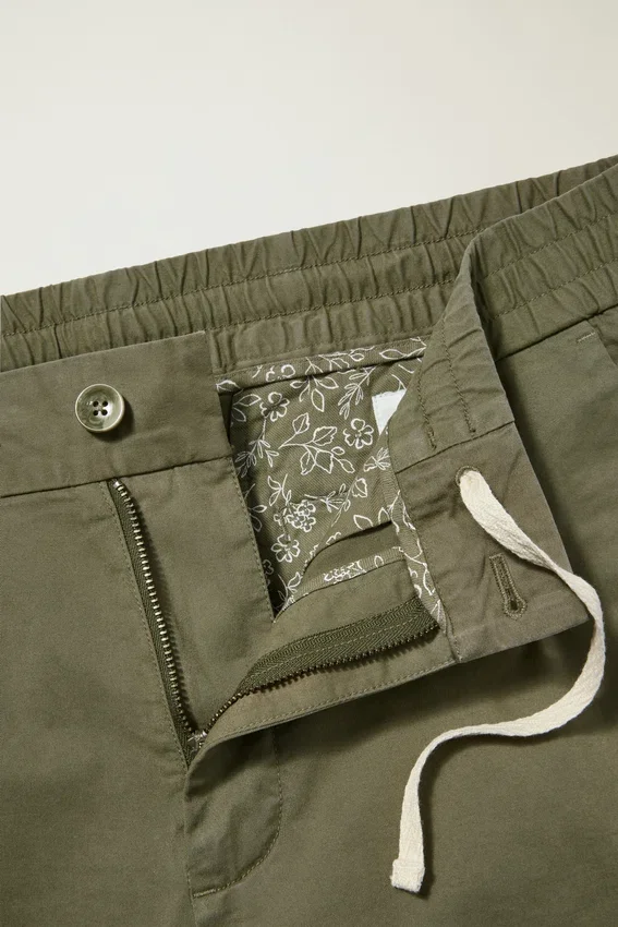 Cordon de serrage naturel à l’intérieur | Fermeture à boutons | Poches imprimées | Poches arrière passepoilées