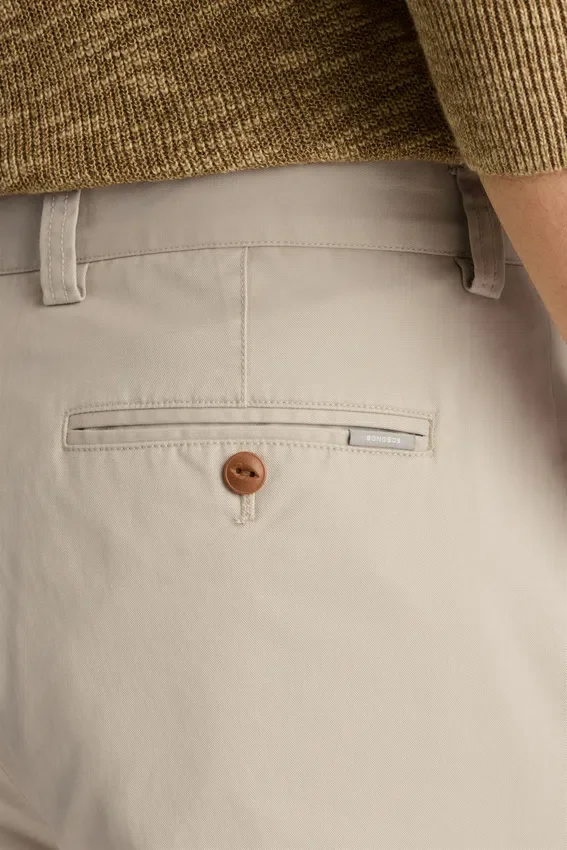 Tissu chino original avec un effet délavé à la pierre | Plis doubles | Poche à monnaie avec rabat | Poches arrière passepoilées avec fermeture à bouton