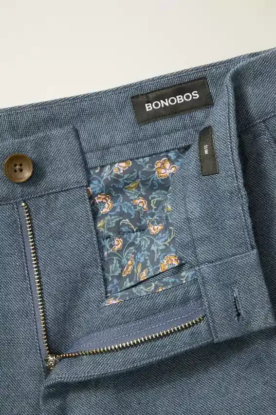 Fermeture à boutons | Poches en biais | Poches arrière passepoilées | Étiquette Bonobos sur la poche arrière