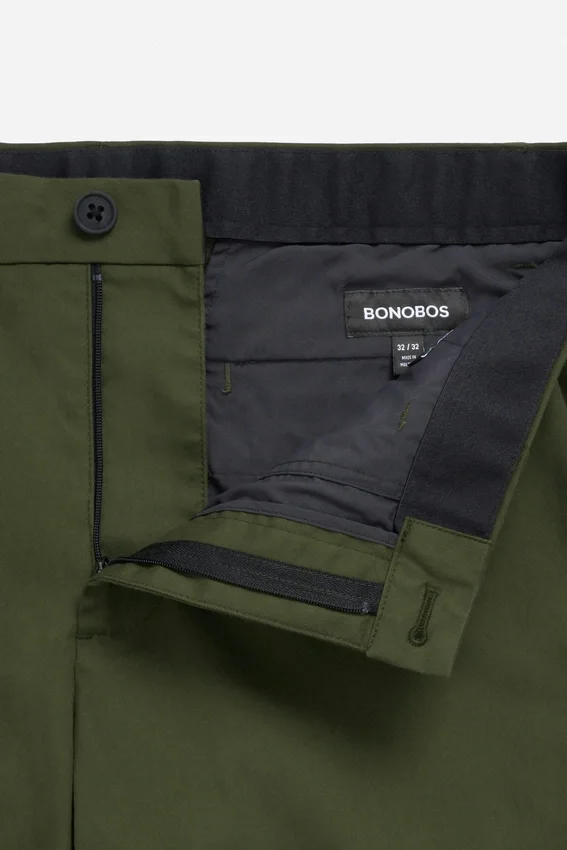 Curved Waistband emblématique de Bonobos avec fermeture à boutons au centre sur le devant. Élastique brossé à l’intérieur de la ceinture pour plus de confort. Poche arrière droite avec fermeture à glissière, poche arrière gauche avec fermeture à bouton-pression dissimulée.