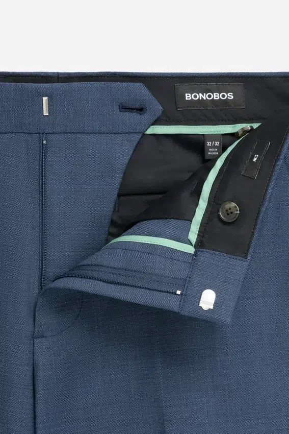 Laine stretch tissée en Italie à l’usine Marzotto | Toutes les couleurs présentent une texture subtile en peau de requin | Poches en biais, fermeture à crochet et barre, boutons sur les poches arrière | Icônes brodées à l’intérieur de la ceinture : « Sécher à l’air libre », « Extensible dans les deux sens », « Lavable en machine » et « Mélange de laine » «