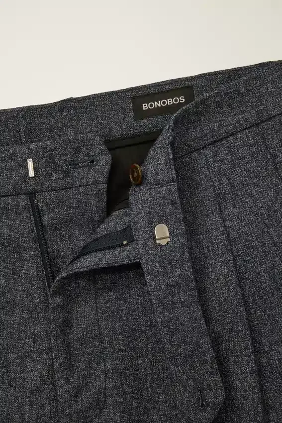 Fermeture à patte allongée | Plis doubles | Doublure sur le devant des jambes | Poches passepoilées à l’arrière