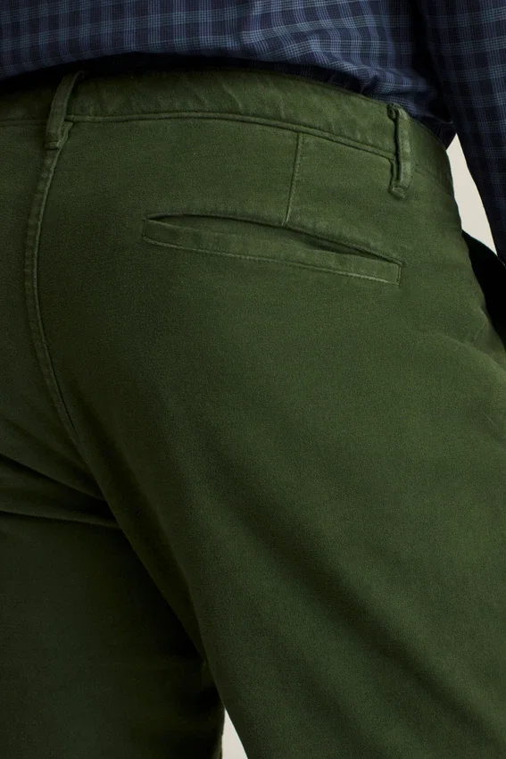 Moleskin italien teint en pièce | Poches à chevrons | Poches arrière à passepoil simple | Fermeture à boutons sur le devant | Pinces à l’arrière de la ceinture pour un ajustement parfait