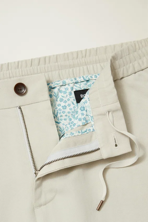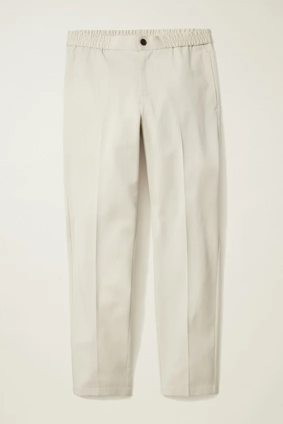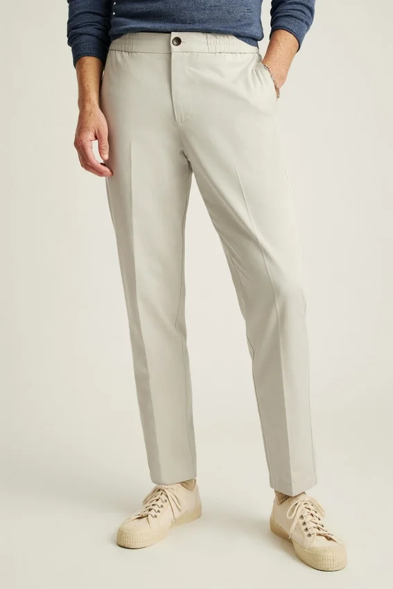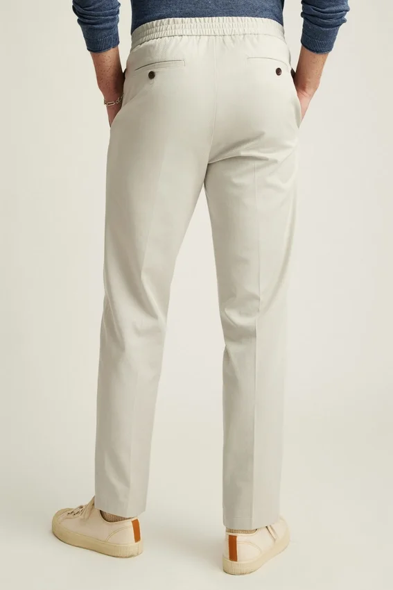 Ceinture élastique hybride | Tissu mélange Tencel + coton | Cordon de serrage intérieur en tricot plat | Fermeture à boutons sur le devant | Poches passepoilées à l’arrière avec fermeture à boutons