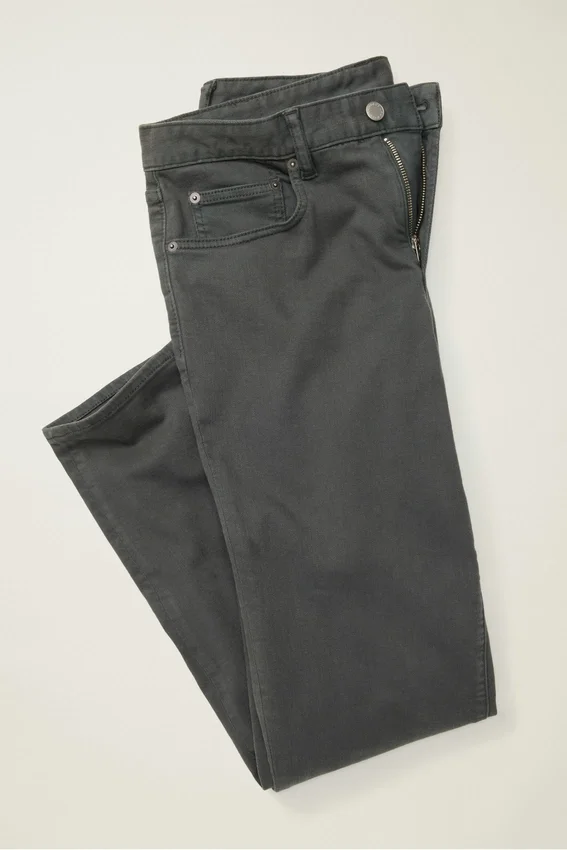 Coton ultra-extensible | Teint en pièce | Style 5 poches | Curved Waistband emblématique | Accessoires métalliques issus de sources responsables | Étiquette en papier certifiée Oeko-Tex et FSC