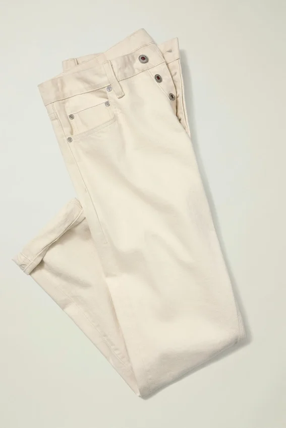 Tige et rivets griffés | Poches en tissu recyclé | Patch arrière en simili cuir « Apple Peel » | Bordure selvedge sur la poche à monnaie et la braguette intérieure