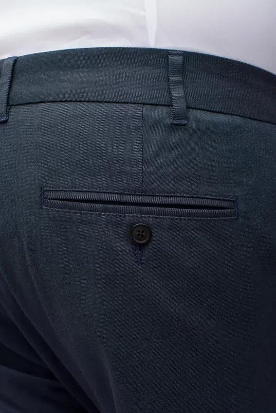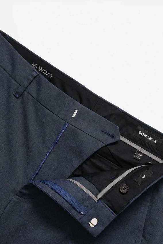 Notre pantalon en coton stretch facile d’entretien, best-seller de la marque, simplifie votre tenue au bureau | Le jour de la semaine est brodé à l’intérieur de la ceinture | Nouveau bouton intérieur griffé