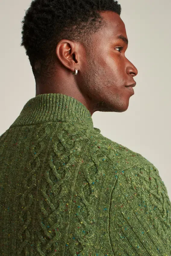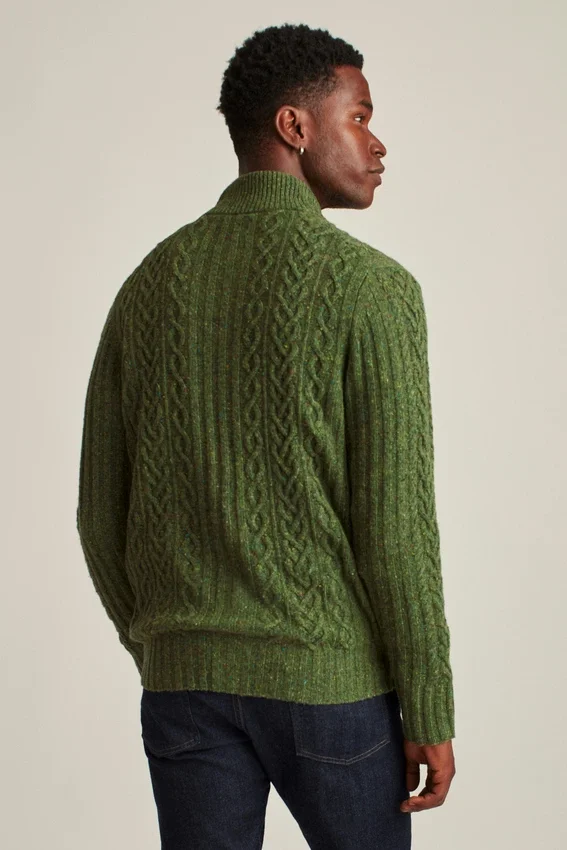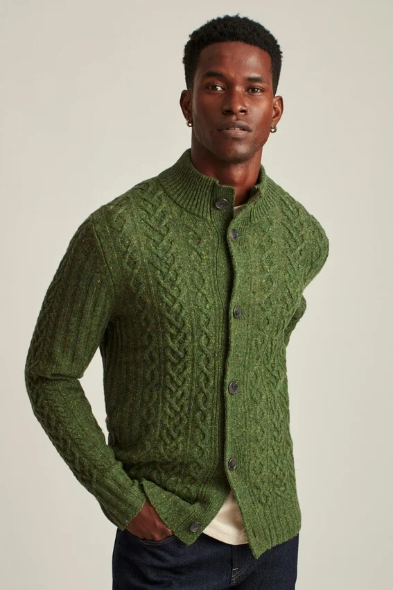 Cardigan à col cheminée en laine mélangée Donegal douillette, entièrement tricoté en torsades. Fermeture à boutons.