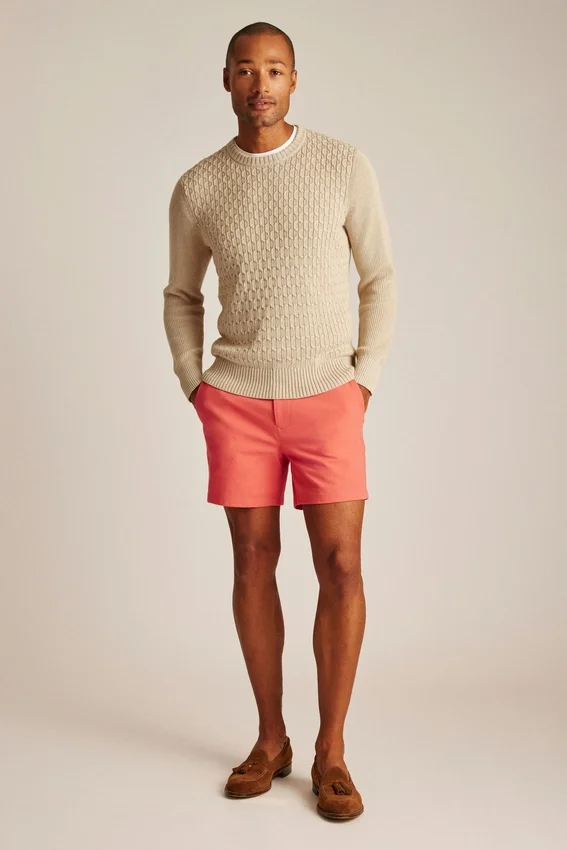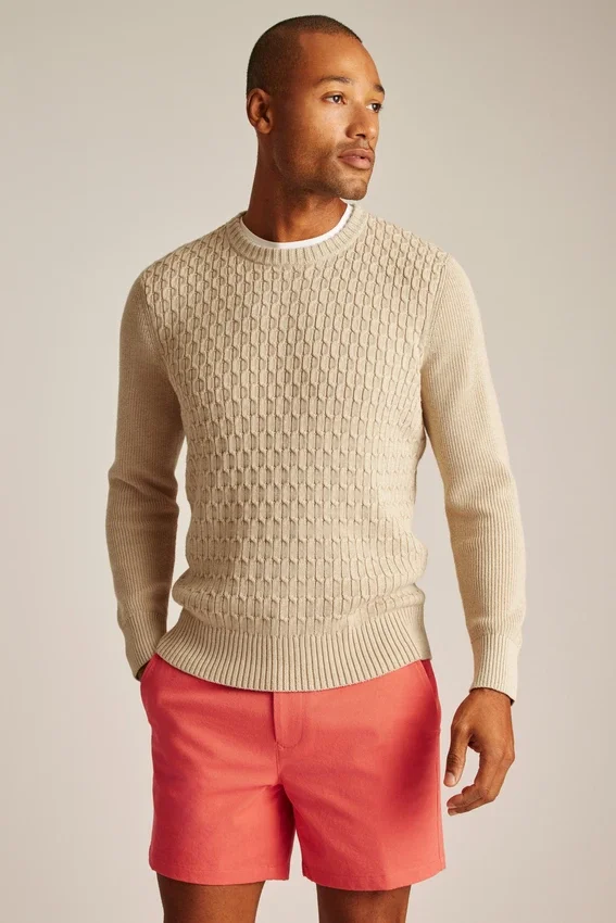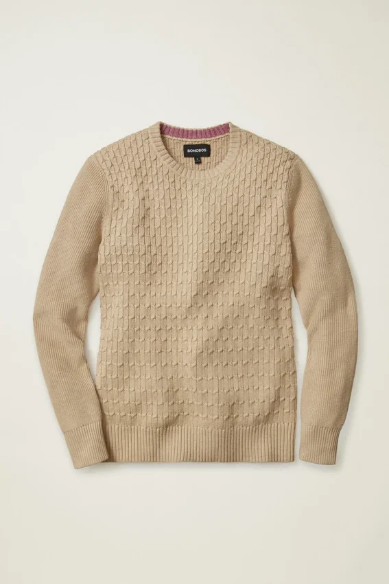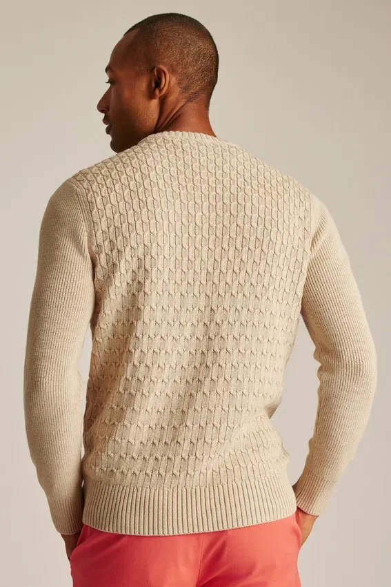 Mélange de coton rafraîchissant | Motifs torsadés sur le corps, côtes de pêcheur sur les manches | Bordures en côtes | Intérieur du col de couleur contrastée
