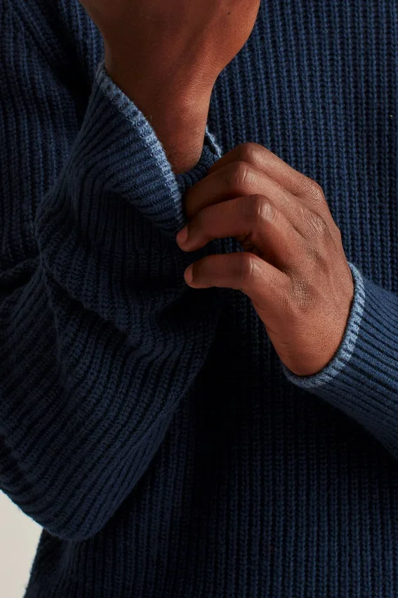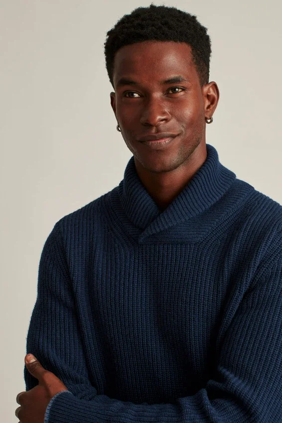 Fil mélangé doux et confortable | Col châle douillet | Mailles côtelées façon pêcheur | Bordures aux poignets