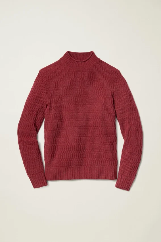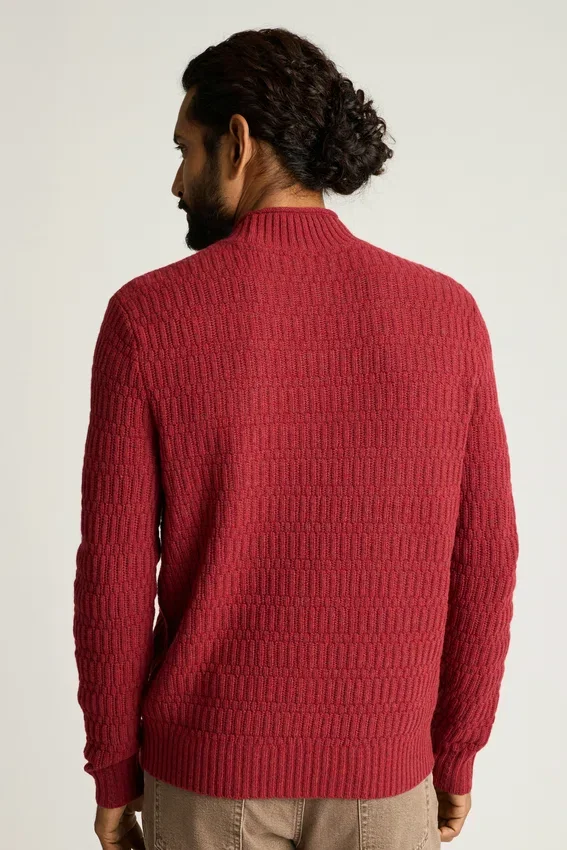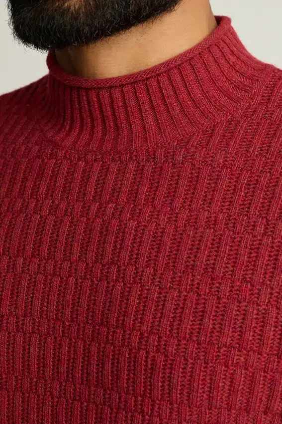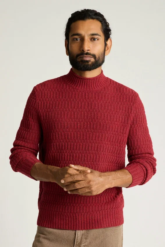 Fil mélangé mérinos doux et confortable | Mailles texturées sur toute la surface | Col montant avec bord roulé | Poids moyen