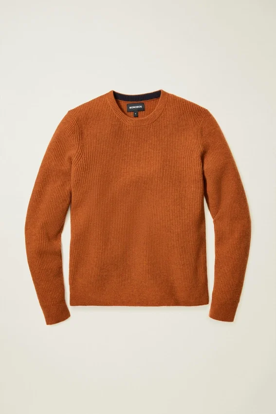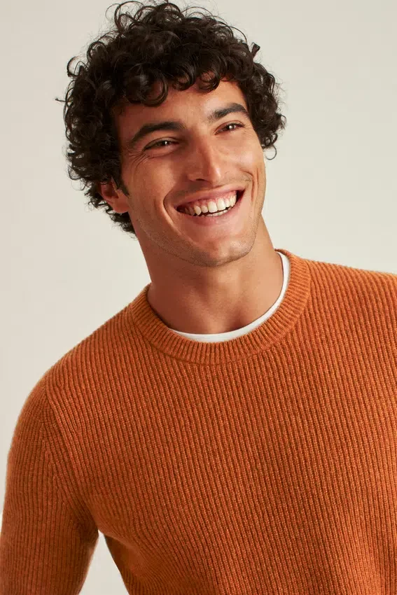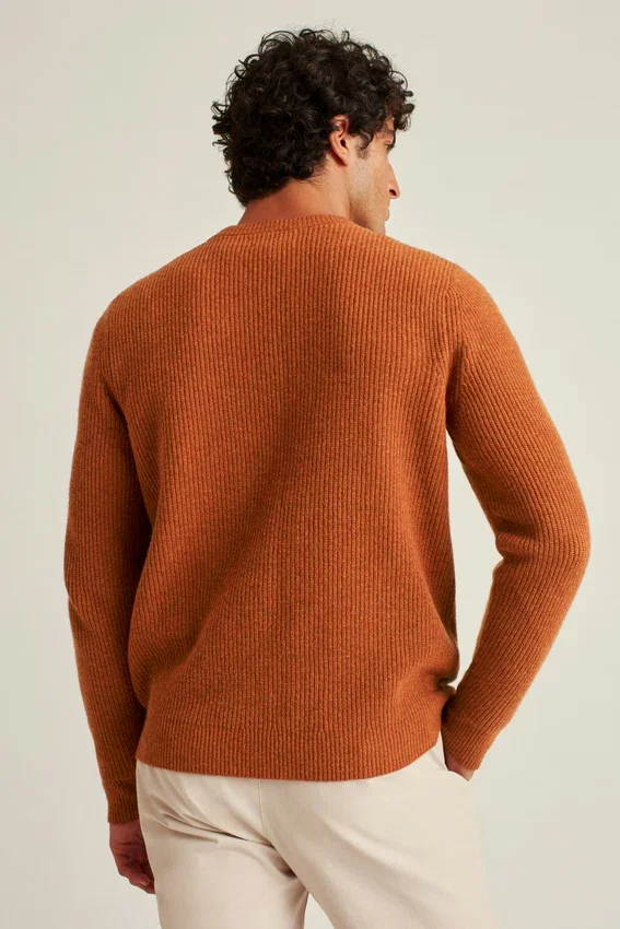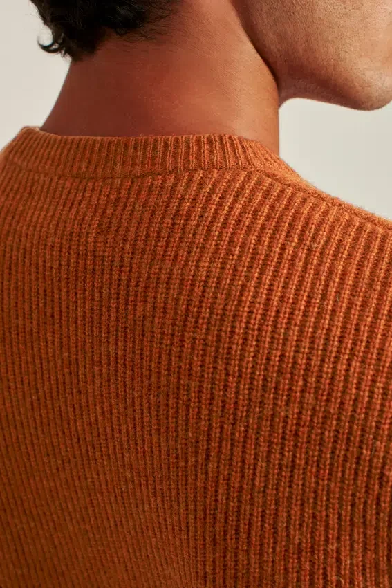 100 % laine mérinos en maille côtelée épaisse. Ni trop lourd, ni trop léger.