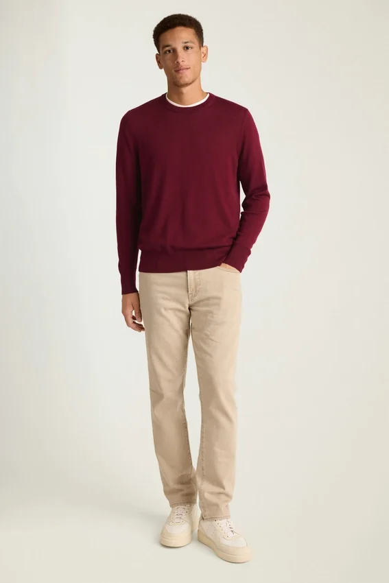 Laine mérinos légère | Corps en jersey | Col raffiné en côtes 1×1 | Poignets et ourlet plus hauts en côtes 1×1 | Bande contrastée cachée à l’intérieur de l’encolure