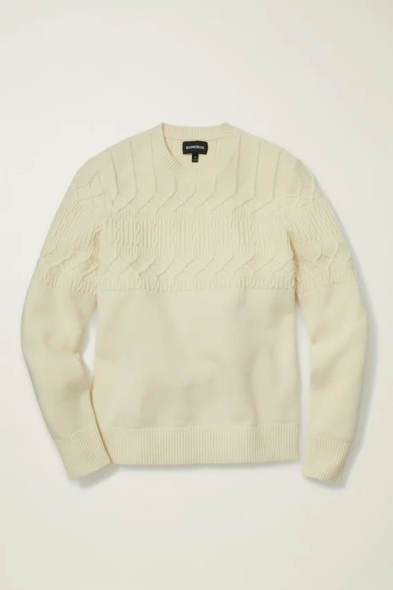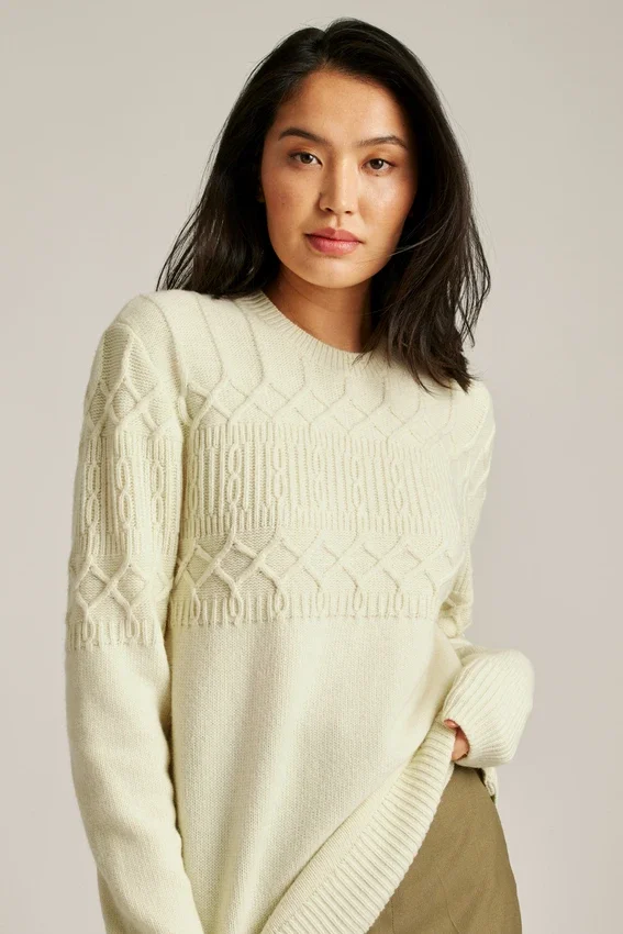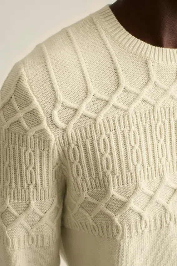 Fil confortable en mélange de laine avec motif torsadé sur le haut du corps et les manches | Jersey sur le bas du corps et les manches | Bordures côtelées