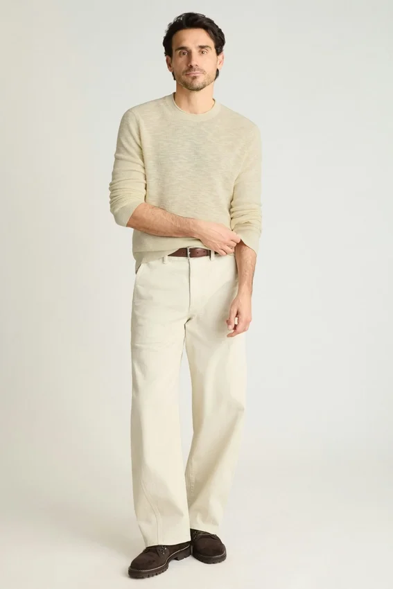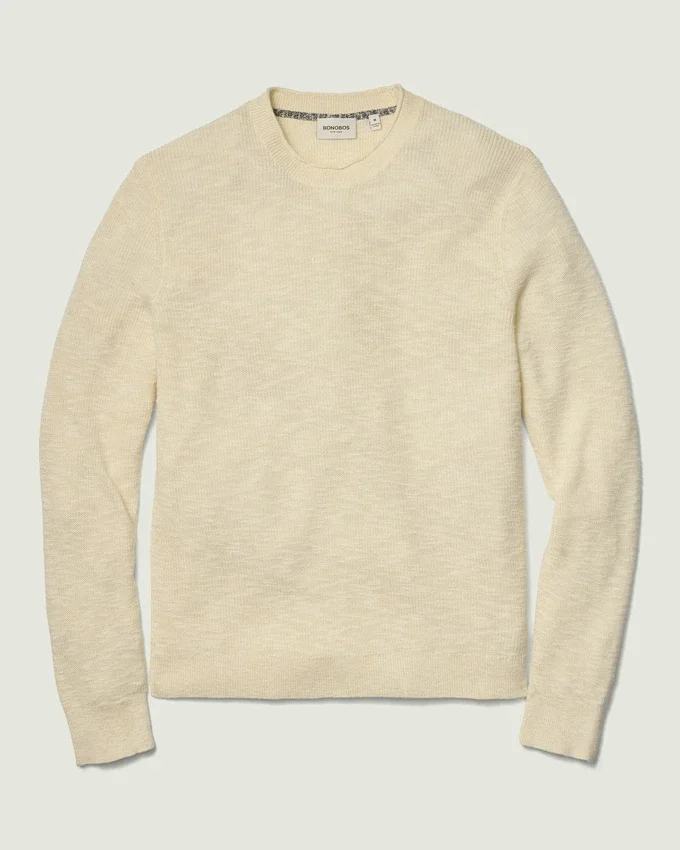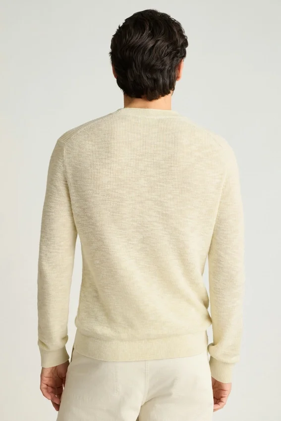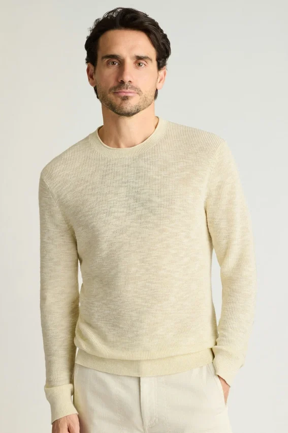 Fil de coton et lin doux à texture flammée | Côtes de pêcheur | Col rond à bord roulé | Bordures côtelées | Manches longues | Léger