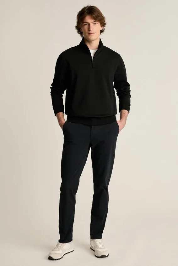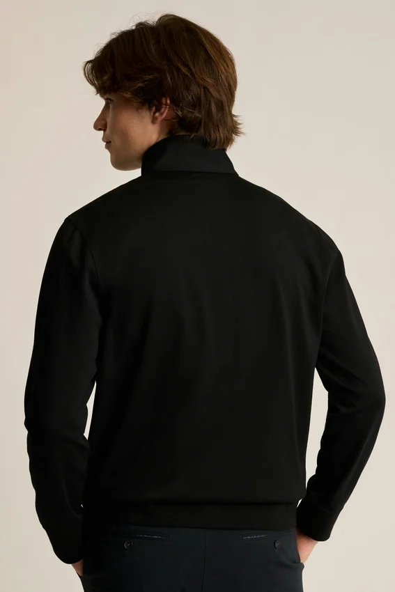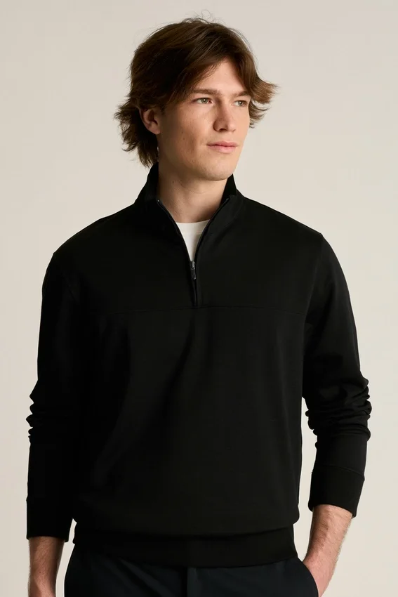 Tissu de poids moyen, doux et lisse | Évacue l’humidité | Col montant avec fermeture à demi-zip | Poignets et ourlet côtelés