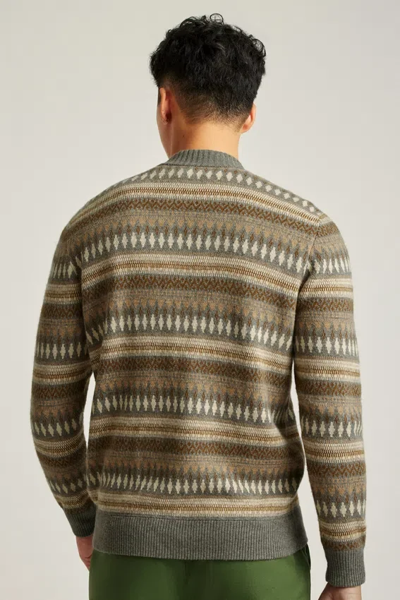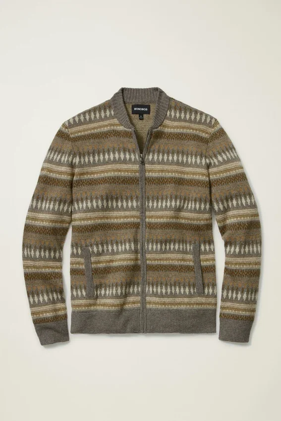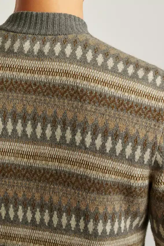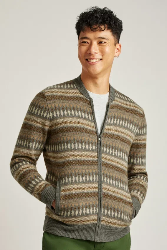 Fil mélangé doux et confortable avec motif Fair Isle de couleur neutre | Bordures côtelées | Fermeture à glissière intégrale | Poches