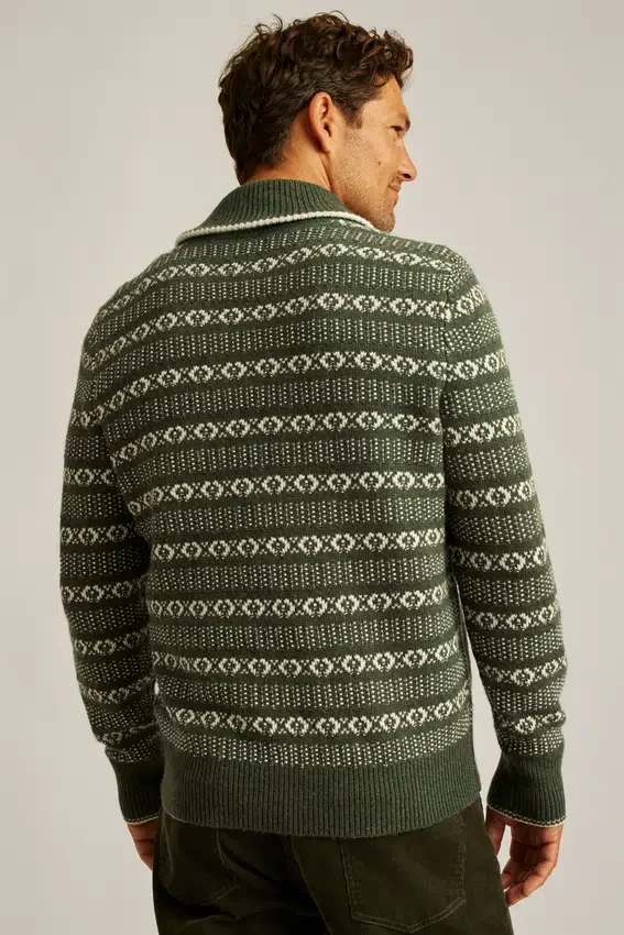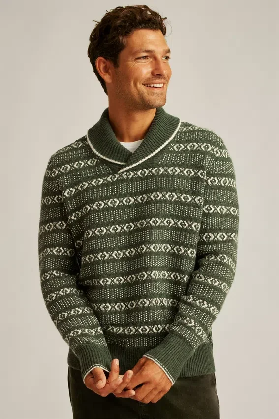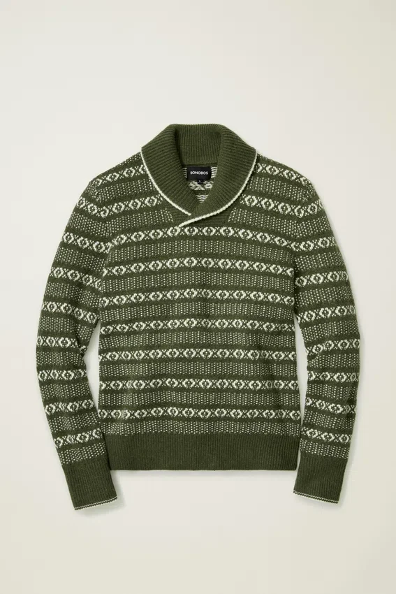 Découvrez le pull à col châle Fair Isle style vintage de Bonobos ! Ce pull à col châle de style Fair Isle est un classique pour affronter le temps frais.