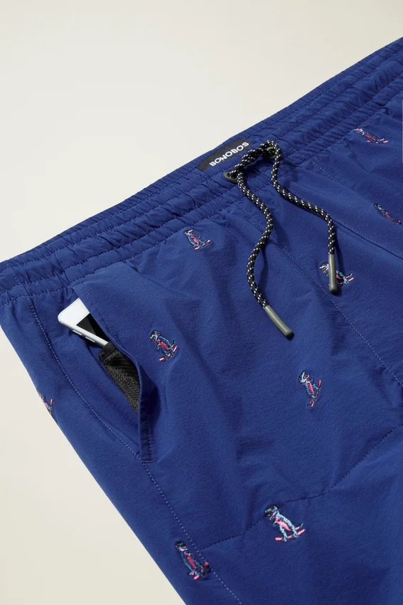 Ceinture élastique | Cordon de serrage avec bordure contrastée et œillets | Poche arrière avec tirette de fermeture éclair contrastée | Poches en filet | Poche multimédia sécurisée dissimulée
