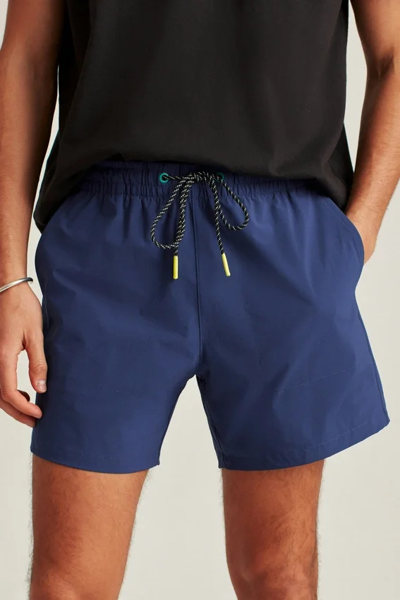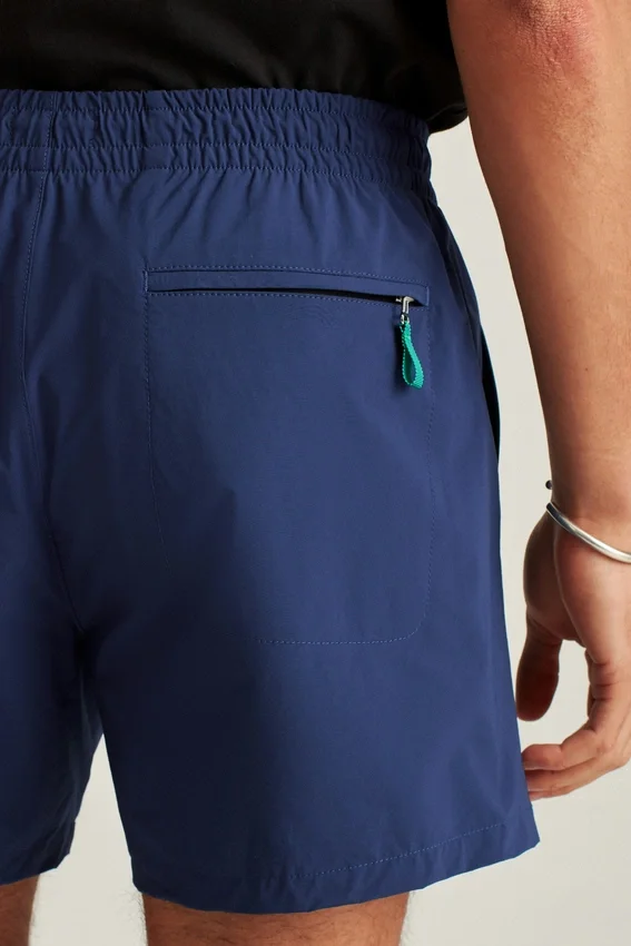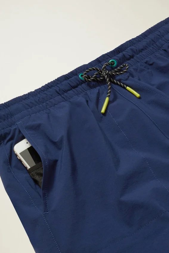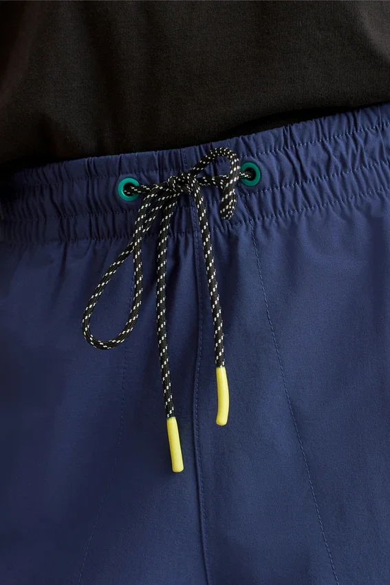 Ceinture élastique | Cordon de serrage avec bordure contrastée et œillets | Poche arrière avec tirette de fermeture éclair contrastée | Poches en filet | Poche multimédia sécurisée dissimulée