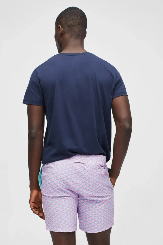 Ceinture élastique avec cordon de serrage extérieur | Doublure intérieure en maille | Poches sur les coutures | Poche plaquée à l’arrière avec fermeture auto-agrippante | Contraste à l’intérieur de la ceinture, dans les poches et sur le porte-clés | Imprimé exclusif